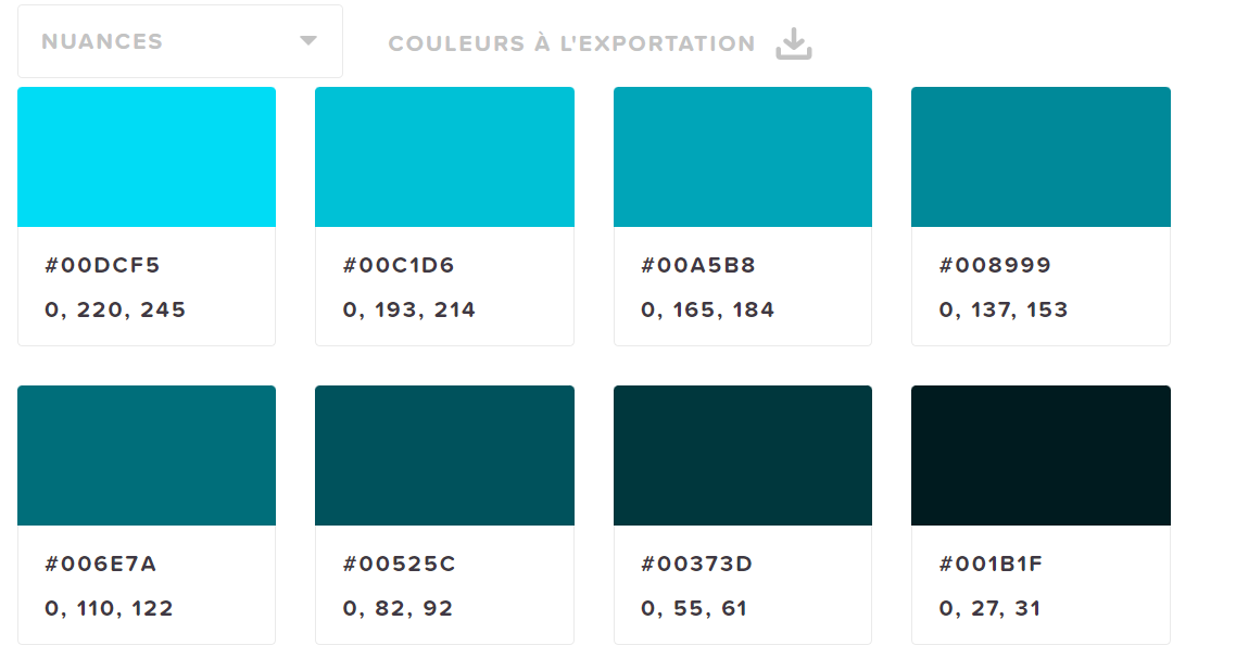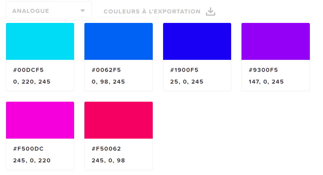 Imaginons que j’ai choisi un bleu clair pour le côté sagesse en couleur principale. Le code hexadécimal associé à cette couleur est le #00DCF5. Comment trouver les combinaisons de couleurs qui s’associent parfaitement avec cette couleur ? Rendez-vous ici sur le site htmlcolorcodes, lequel vous propose plusieurs types d’associations :