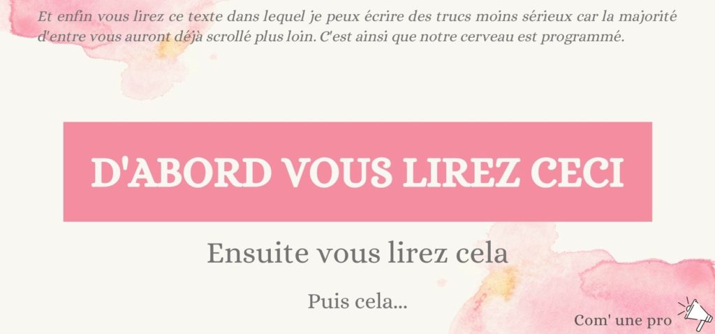 - Evitez de mettre du texte directement sur une photo ou sur une image très colorée. Les variations de couleurs importantes pourront créer des manques de lisibilité sur certaines parties de votre texte. C’est ainsi que vous voyez souvent des posts contenant des photos sur lesquels une bande de couleur unie a été insérée entre la photo et le texte pour mieux faire ressortir ce dernier.